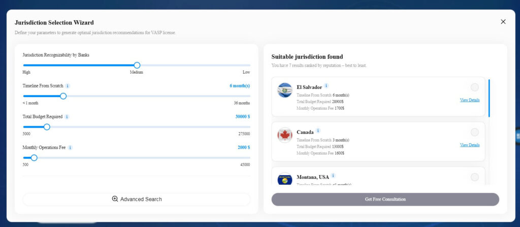 As a legal consulting firm for crypto business, their crypto lawyers built a tool that runs a client’s budget, timeline, banking needs, and monthly costs against 50+ jurisdictions and returns a shortlist of where they should actually apply.