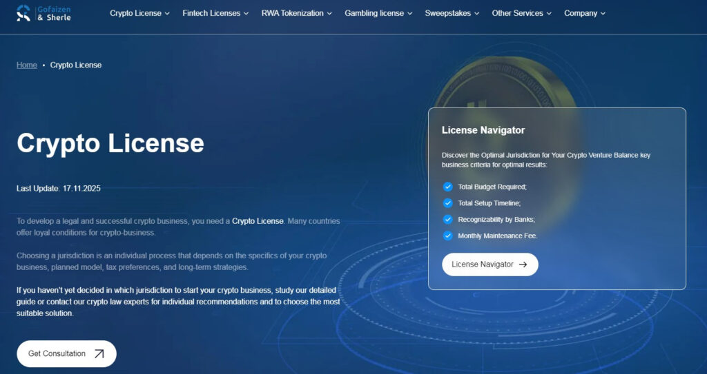 | Gofaizen & Sherle | 50+ jurisdictions | Multi-jurisdiction licensing, AML/CTF compliance | Crypto License Navigator tool |